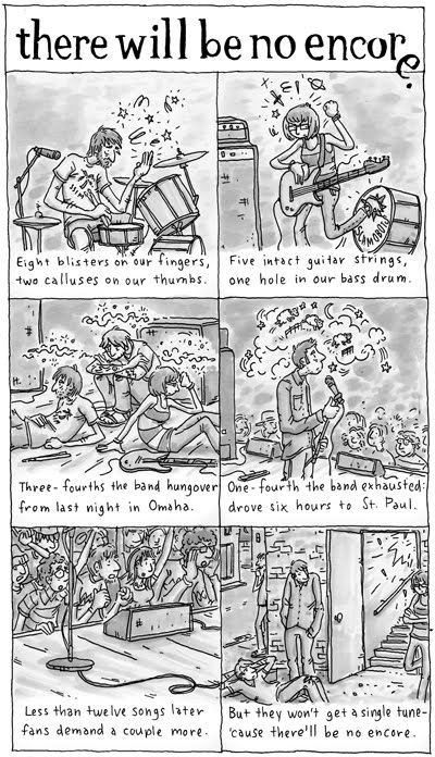 This cartoon pays homage to one of the Top 25 Most Played songs on my iPod: "Music for a Large Ensemble" by Steve Reich. I can name every instrument in the drawing except for the fish-shaped-percussion-thing on the far right. A free burned Steve Reich sampler mix to the clever person who can tell me what that instrument is called.