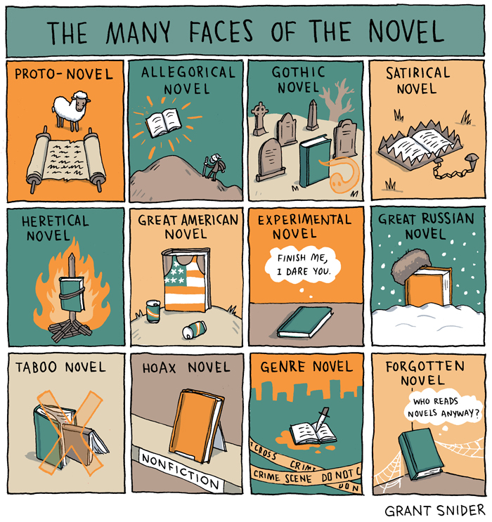 Illustration for John Sutherland's review of "The Novel: A Biography' by Michael Schmidt, appearing in the August 10 NY Times Book Review. Thanks to AD Nicholas Blechman!